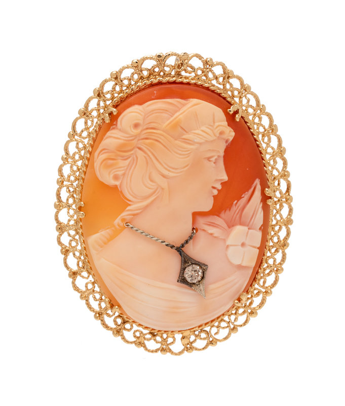Consisting of a carved cameo depicting the profile of a woman, with attached necklace containing one old European cut diamond weighing approximately 0.15 carat. Mounted in yellow gold.