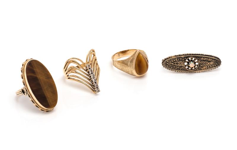 Consisting of a ring containing one oval shape tiger's eye plaque measuring approximately 29.00 x 16.00 mm, a ring containing six round brilliant cut diamonds weighing approximately 0.40 carat total, a brooch containing one round cabochon cut opal measuring approximately 2.90 mm in diameter, together with a ring containing one pear shape cabochon cut cat's eye quartz measuring approximately 14.40 x 9.55 x 5.50 mm.