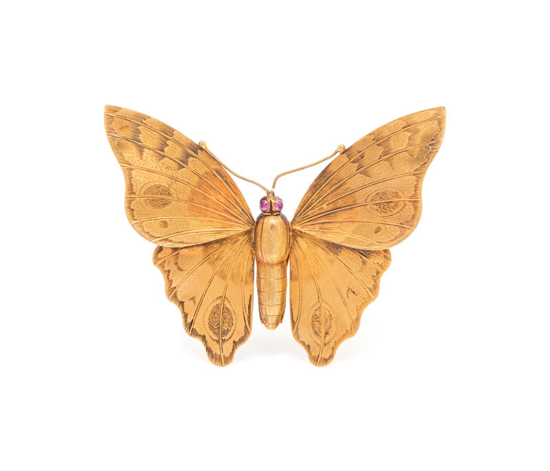 With engraved detail on the wings and body and two round cabochon cut ruby eyes.