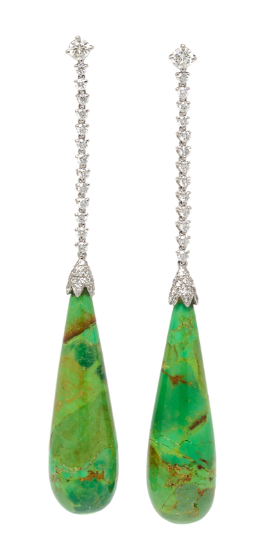 Containing numerous round brilliant cut diamonds weighing approximately 1.30 carats total and two drop variscite measuring approximately 38.00 x 6.75 mm. Mounted in white gold.