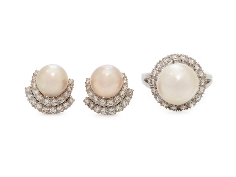 Consisting of a ring containing one pearl measuring approximately 11.50 mm in diameter and 36 round brilliant cut diamonds weighing approximately 1.05 carats total, together with a pair of earrings containing two out of round pearls measuring approximately 9.00 mm wide and 40 round brilliant cut diamonds weighing approximately 0.80 carat total. Mounted in platinum.