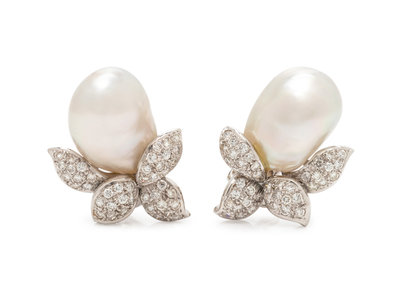 ADLER, CULTURED BAROQUE PEARL AND DIAMOND EARCLIPS