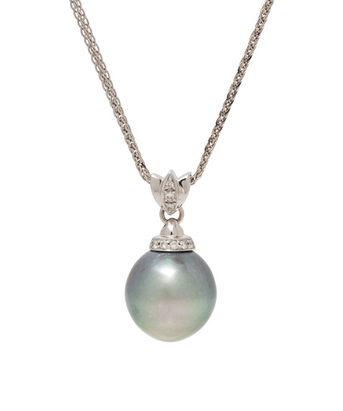Consisting of a pendant containing one Tahitian pearl measuring approximately 13.50 mm in diameter and eight round brilliant cut diamonds weighing approximately 0.08 carat total, suspended from a foxtail chain. Mounted in white gold.