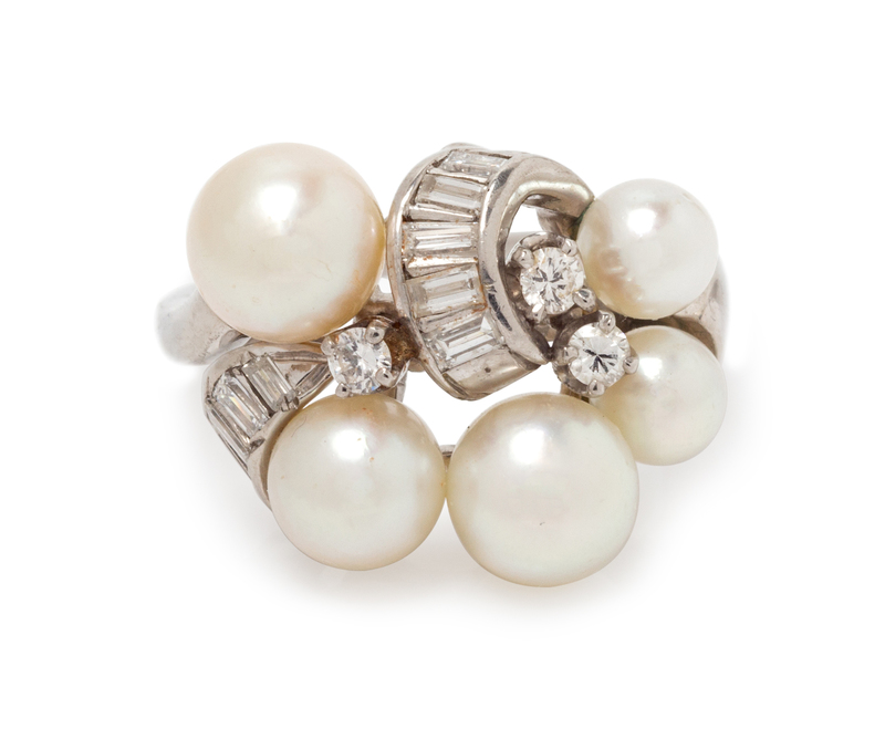 Containing five pearls measuring approximately 5.50-7.50 mm in diameter, nine baguette cut diamonds weighing approximately 0.35 carat total and three round brilliant cut diamonds weighing approximately 0.12 carat total. Mounted in white gold and platinum.