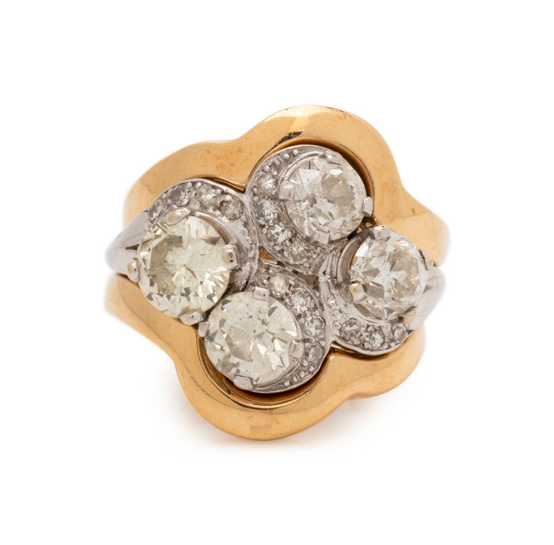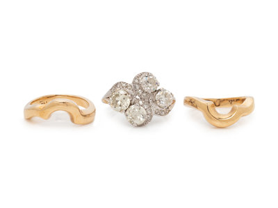 Consisting of a platinum ring by C.D. Peacock containing four old European cut diamonds weighing approximately 2.95 carats total and 15 single cut diamonds, together with two yellow gold ring jackets.