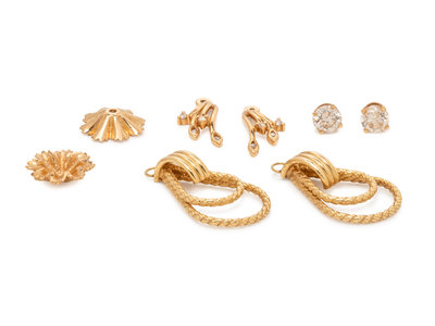 Consisting of a pair of stud earrings containing two round brilliant cut diamonds weighing approximately 1.00 carat total, together with two pairs of yellow gold earring jackets and one pair of yellow gold earring jackets containing eight round brilliant cut diamonds.