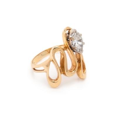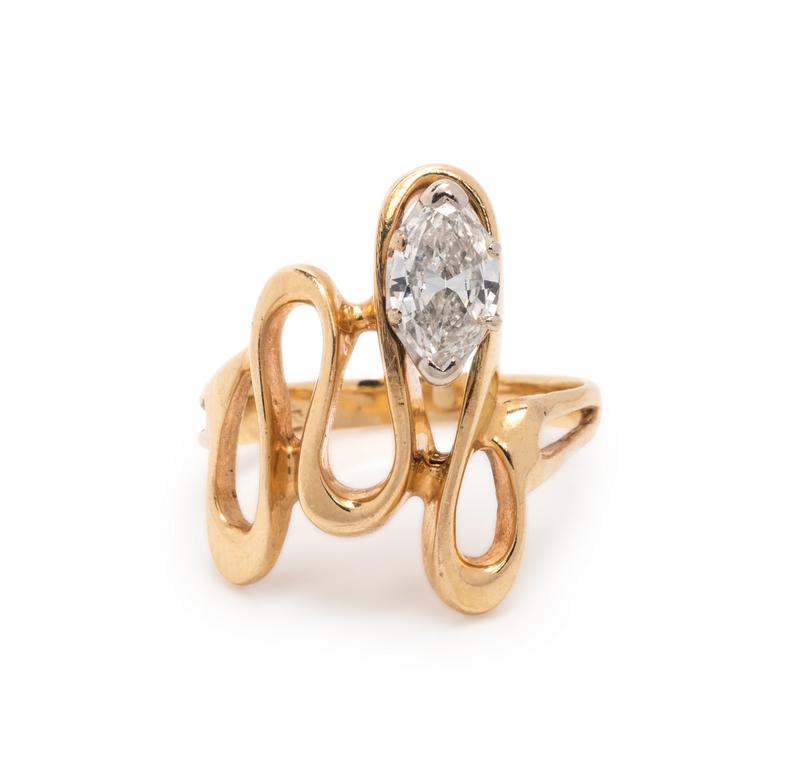 Consisting of a yellow gold curving ring containing one marquise cut diamond weighing approximately 1.00 carat, with the diamond mounted in white gold.