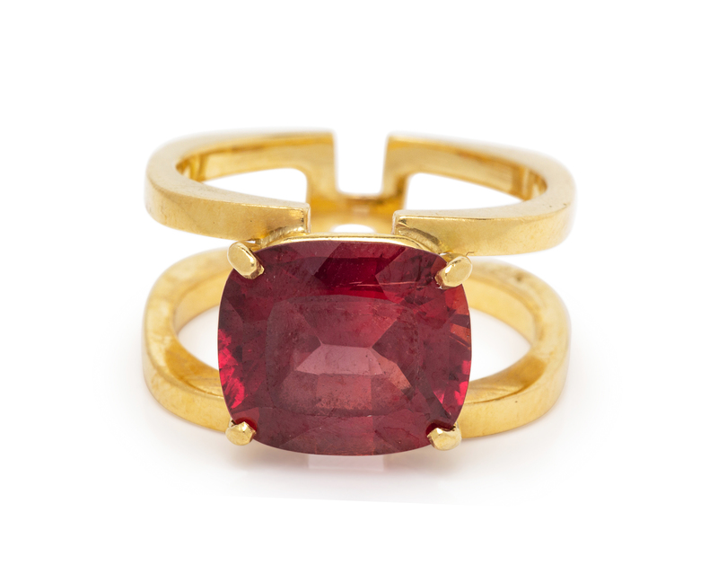 Containing one cushion shape reddish orange sapphire measuring approximately 9.80 x 11.10 x 5.80 mm. Mounted in yellow gold.