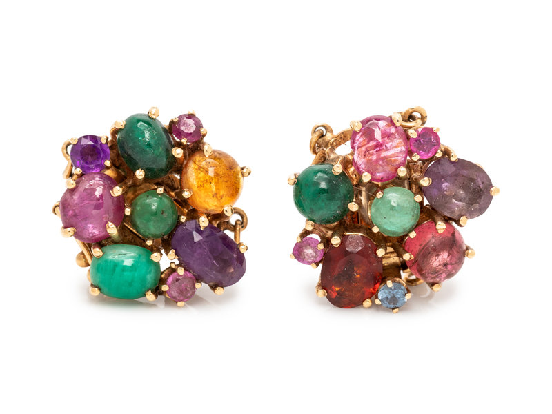 Containing oval and round mixed cut and cabochon gemstones including amethyst, garnet and sapphire. Mounted in yellow gold.