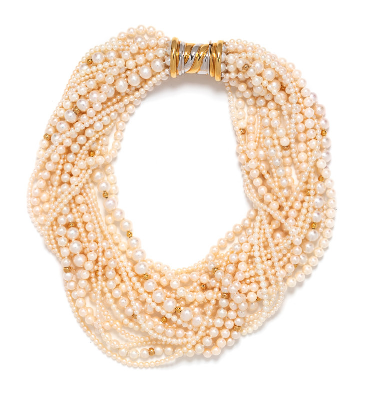 Consisting of 19 strands of pearls measuring approximately 3.00-8.00 mm interspersed with yellow gold beads, strung knotted with a bicolor gold clasp.