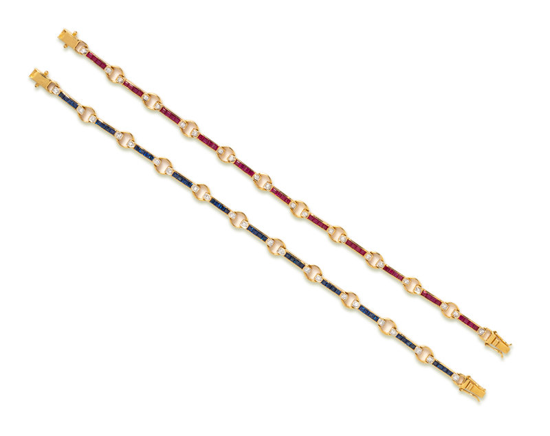Consisting of a bracelet containing 44 square step cut rubies measuring approximately 1.50 x 1.50 mm and 22 round brilliant cut diamonds weighing approximately 0.22 carat total, together with a bracelet containing 44 square step cut sapphires measuring approximately 1.50 x 1.50 mm and 22 round brilliant cut diamonds weighing approximately 0.22 carat total.