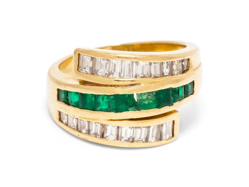 Containing nine square and rectangular step cut emeralds and 18 baguette cut diamonds weighing approximately 0.75 carat total. Mounted in yellow gold.