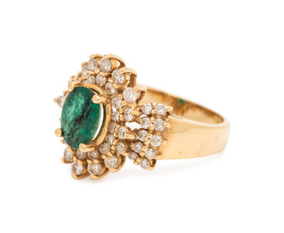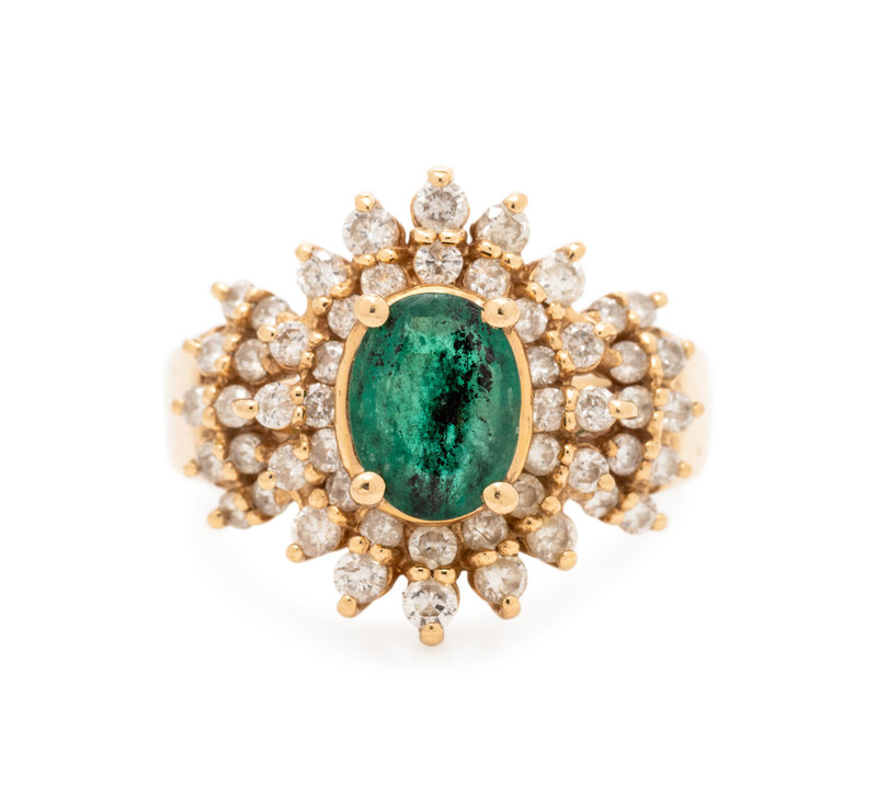Containing one oval shape mixed cut emerald measuring approximately 8.10 x 6.10 x 3.50 mm and 52 round brilliant cut diamonds weighing approximately 0.52 carat total. Mounted in yellow gold.