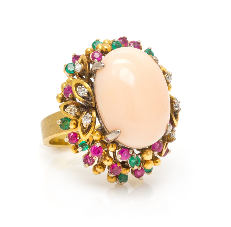 CORAL, DIAMOND, EMERALD AND RUBY RING
