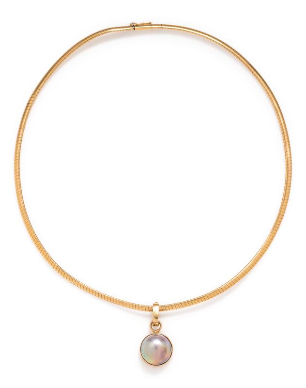 Consisting of an omega link necklace measuring approximately 3.00 mm wide suspending a pendant containing one grey mabe pearl measuring approximately 15.00 mm.