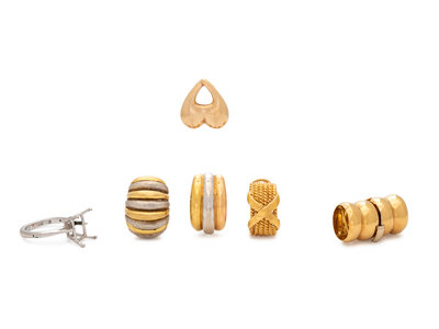 Consisting of a platinum ring mounting, a yellow gold clasp, a yellow gold heart brooch, a single yellow gold 'X' motif earclip by Schlumberger for Tiffany & Co., a single bicolor gold half hoop earclip, together with a single tricolor gold half hoop earclip.