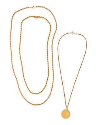 Consisting of two rope chain necklaces and one necklace with pendant containing one $5 Liberty coin, dated 1886, suspended from a rope chain.