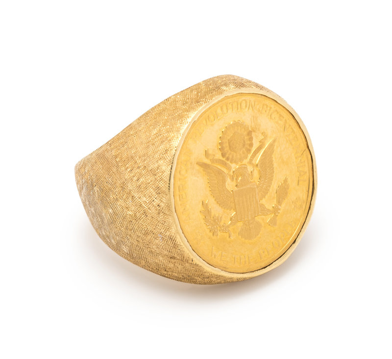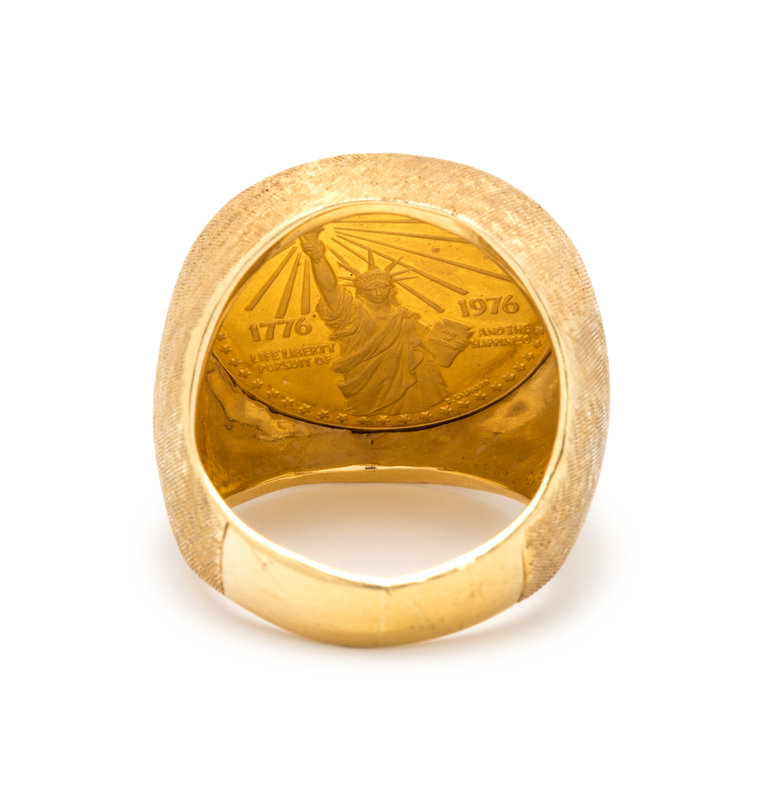 Containing one American Bicentennial gold coin. Mounted in textured yellow gold.