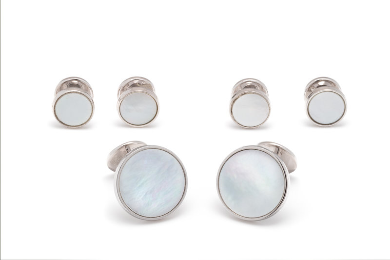 Consisting of a pair of cufflinks containing two round mother-of-pearl plaques measuring approximately 14.60 mm in diameter, together with four shirt studs containing round mother-of-pearl plaques measuring approximately 8.50 mm in diameter. Mounted in sterling silver.