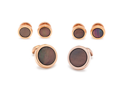 Consisting of a pair of cufflinks containing two round black mother-of-pearl plaques measuring approximately 13.00 mm in diameter, together with four shirt studs containing round black mother-of-pearl plaques measuring approximately 8.30 mm in diameter. Mounted in rose gold plated silver.