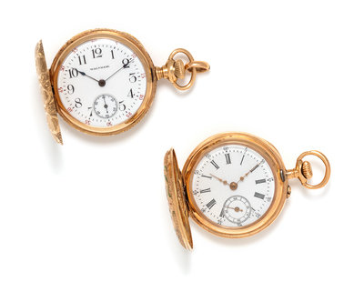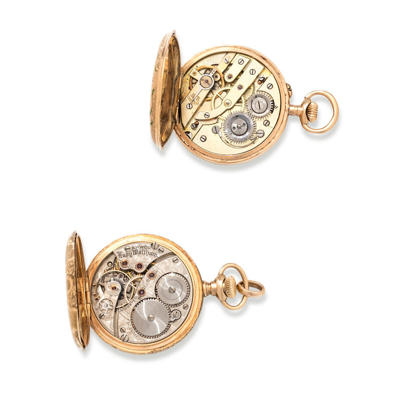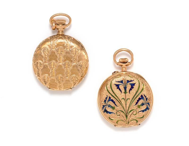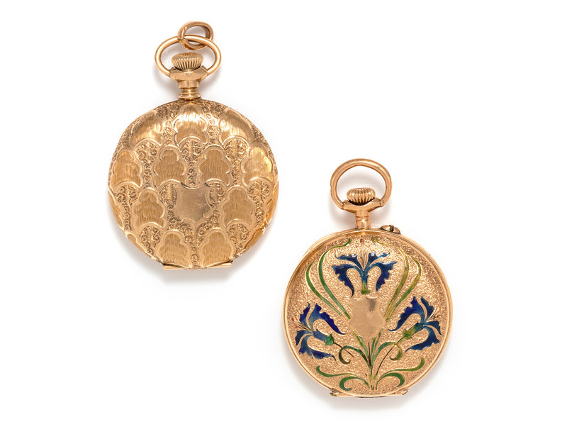 Consisting of a pocket watch with 32.00 mm case diameter, white single-sunk dial signed WALTHAM, black Arabic numerals, blued steel spade hands, subdial for seconds at 6 o'clock, case engraved with a foliate motif and blank cartouche, stem wound and set movement, together with an enamel pocket watch with a 32.00 mm case diameter, white dial, black Roman numerals, gold fancy hands, subdial for seconds at 6 o'clock, case engraved with a foliate motif with blue and green enamel and blank cartouche, stem wound and lever set movement.