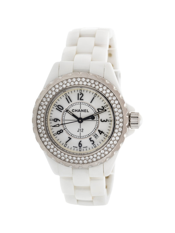The bezel containing numerous round brilliant cut diamonds weighing approximately 0.25 carat total, 33.00 mm case diameter, white dial signed CHANEL, black Arabic numerals, luminous black baton hands with center sweep seconds, date aperture at 4 o'clock, case back affixed by eight screws, quartz movement, white ceramic link bracelet, double deployant clasp.