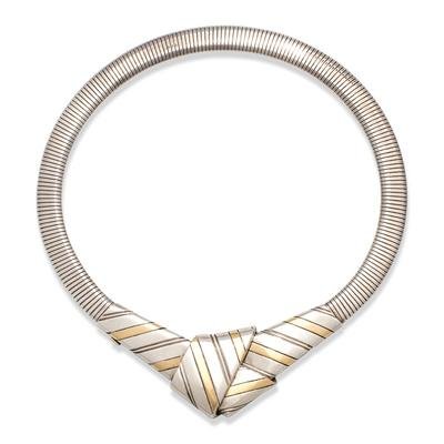 Consisting of a tubogas necklace measuring approximately 10.00 mm wide, with a knot motif with yellow gold accents.