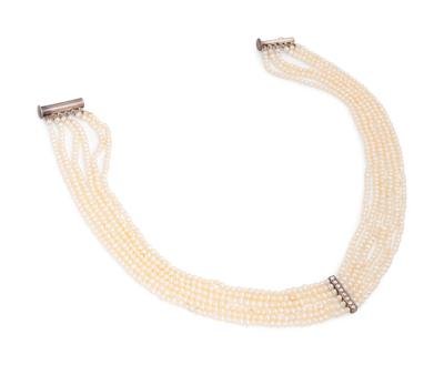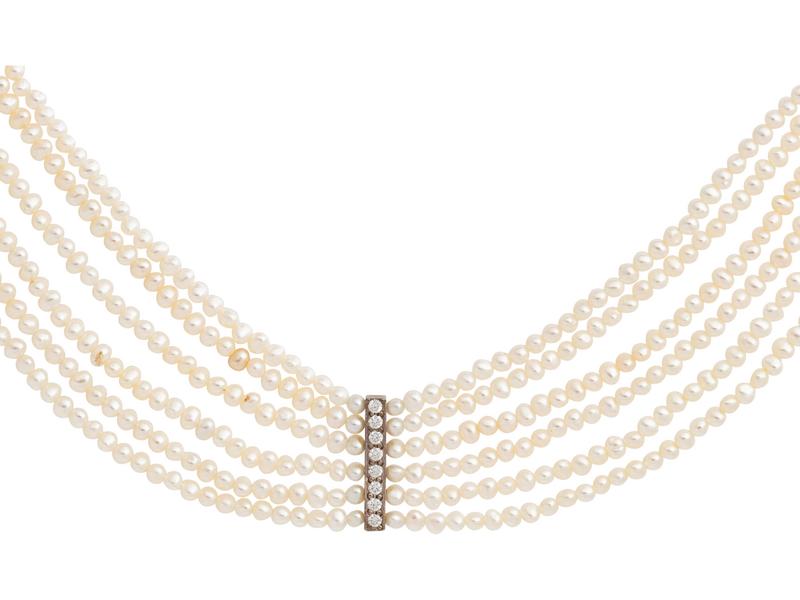 Consisting of an eight strand pearl bracelet, together with a six strand pearl necklace with central spacer containing eight diamond simulants.