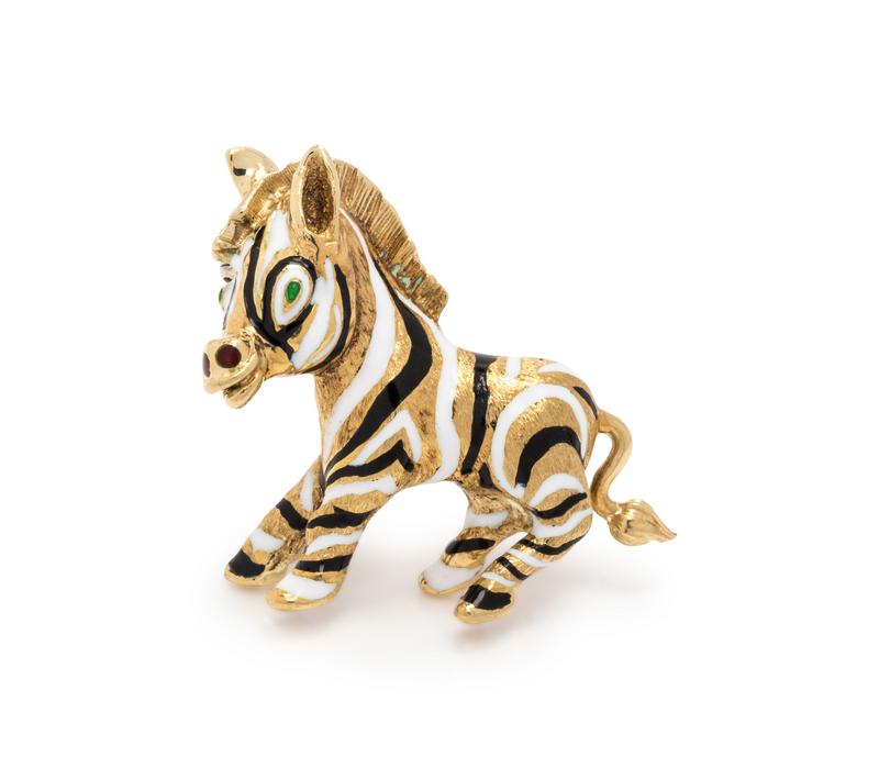 YELLOW GOLD AND POLYCHROME ENAMEL ZEBRA BROOCH