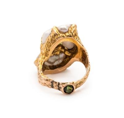 Containing one oval mixed cut peridot measuring approximately 11.50 x 10.00 mm and two Baroque pearls measuring approximately 15.00 x 9.00-10.00 mm, the back of the ring containing one round mixed cut peridot measuring approximately 4.00 mm in diameter.