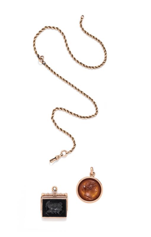 Consisting of a round intaglio pendant depicting a male profile and a rectangular intaglio depicting three mythical male profiles, together with a rose gold fob chain.