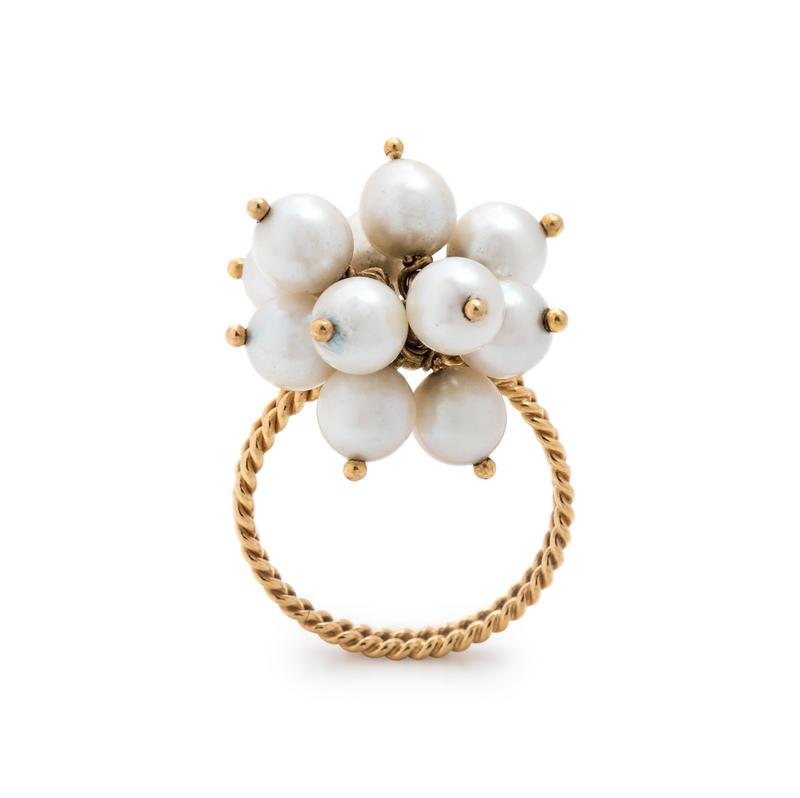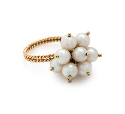 Containing 13 pearl beads measuring approximately 5.50 mm in diameter. Mounted in yellow gold.