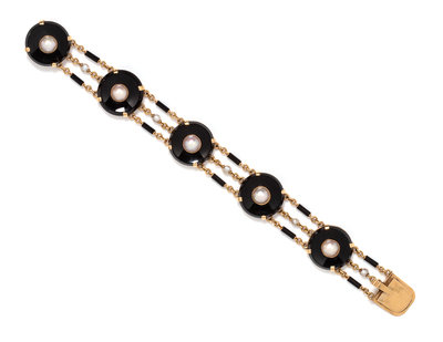 Consisting of five onyx plaques measuring approximately 18.00 mm in diameter and surmounted with pearls and spacer chains. Mounted in yellow gold.