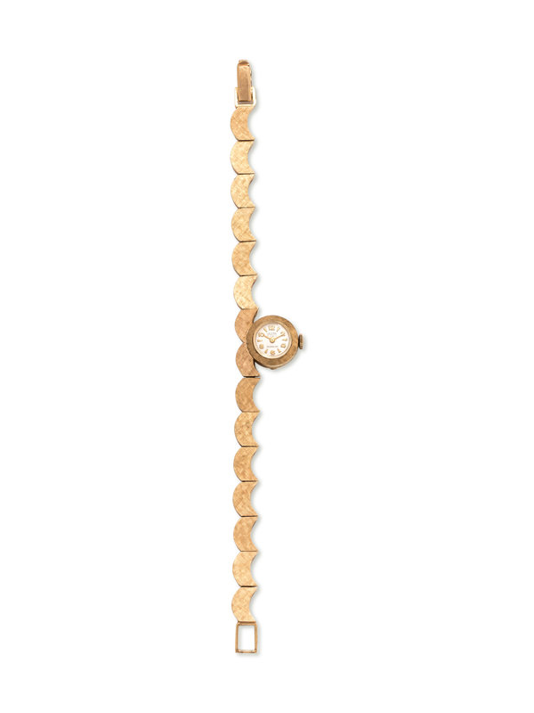15.00 mm case diameter, white dial signed SELLITA, applied Arabic and triangular numerals, gold pencil hands, snap on case back, 17 jewel manual wind movement signed SELLITA WATCH, textured gold bezel and curved link bracelet, fold over clasp with safety chain.