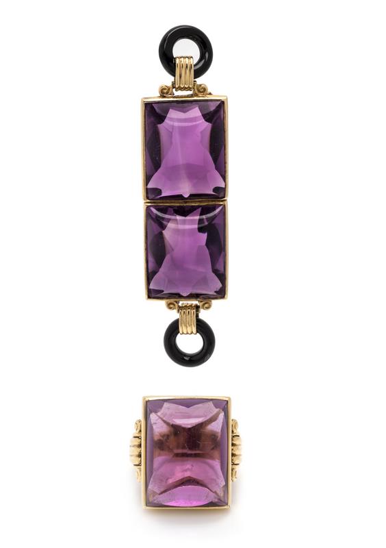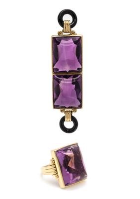 Consisting of a brooch containing two rectangular sugarloaf cabochon amethyst measuring approximately 18.00 x 13.80 x 10.50 mm and two circular open onyx pendants, together with a ring containing one rectangular sugarloaf cabochon amethyst measuring approximately 17.60 x 13.30 x 9.90 mm. Mounted in yellow gold.