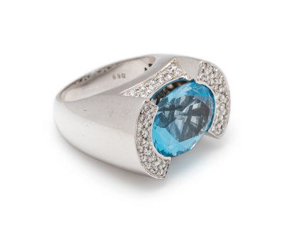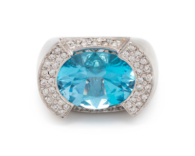Containing one oval mixed cut blue topaz measuring approximately 16.00 x 12.00 mm and 58 round brilliant cut diamonds weighing approximately 0.55 carat total. Mounted in white gold.
