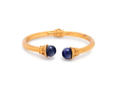 Consisting of a ribbed cuff bracelet, the terminals with sodalite spheres measuring approximately 9.90 mm in diameter, with granulation style detail, hinged at back.