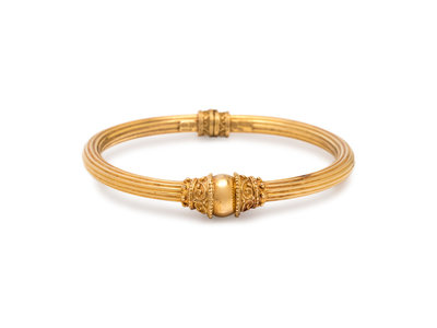 Consisting of a ribbed bangle bracelet, with granulation style detail, hinged at back.