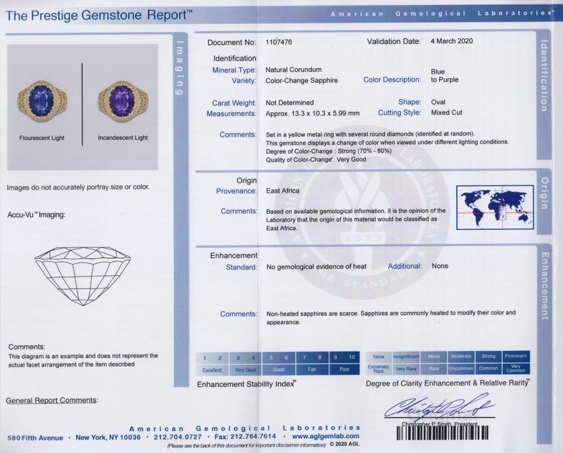 AGL, 2020, Report number 1107476, Natural Corundum, Color-Change Sapphire, East Africa, Unheated