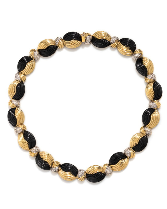 Consisting of ribbed gold links surmounted with carved onyx plaques, with white gold sections containing 96 round brilliant cut diamonds weighing approximately 1.00 carat total.