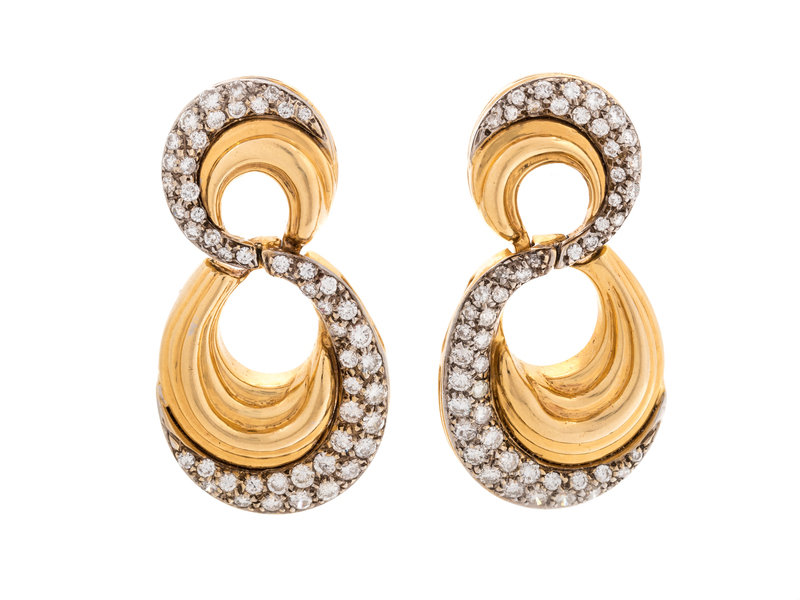 Consisting of ribbed drop earclips with white gold detail containing 102 round brilliant cut diamonds weighing approximately 1.50 carats total.