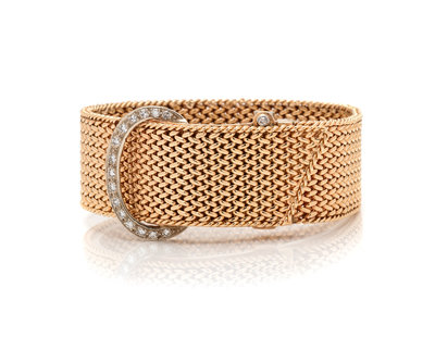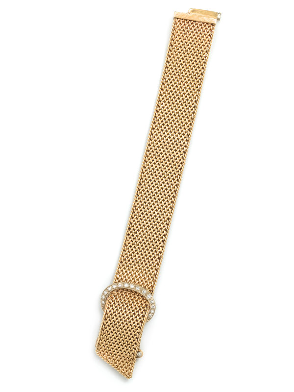 Consisting of a yellow gold woven link bracelet measuring approximately 20.00 mm wide, with white gold buckle motif and clasp containing 16 single cut diamonds.