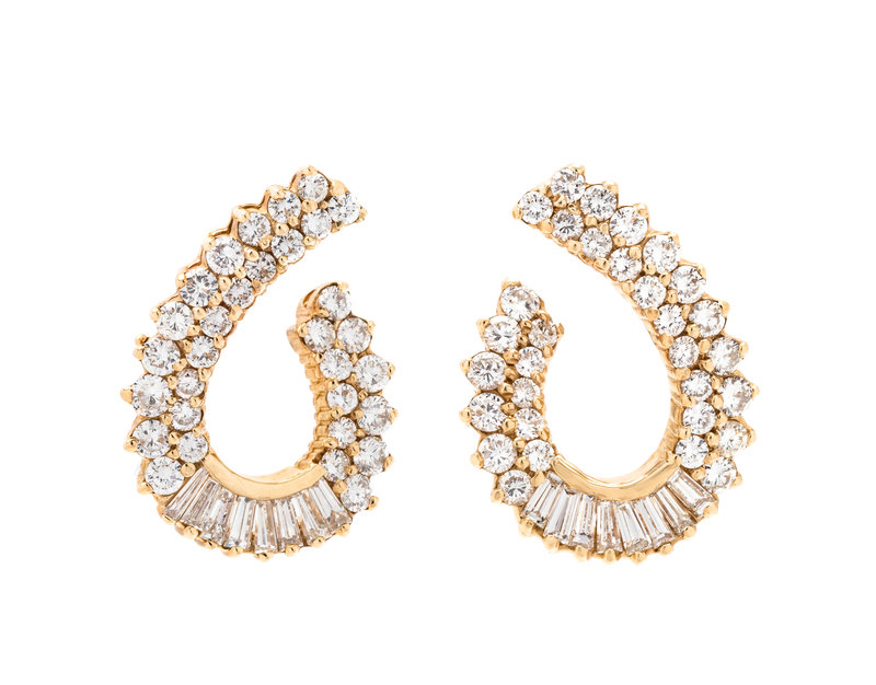 Containing 62 round brilliant cut diamonds weighing approximately 3.10 carats total and 16 tapered baguette cut diamonds weighing approximately 0.80 carat total, posts with clip backs. Mounted in yellow gold.