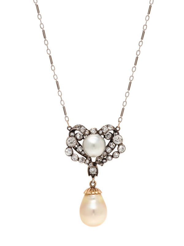 Containing 36 old European, old mine and mixed cut diamonds, one pearl (origin not tested) measuring approximately 8.60 mm in diameter and one pearl (origin not tested) drop measuring approximately 13.80 x 10.45 mm, suspended from a later white gold fancy link chain. Mounted in silver.