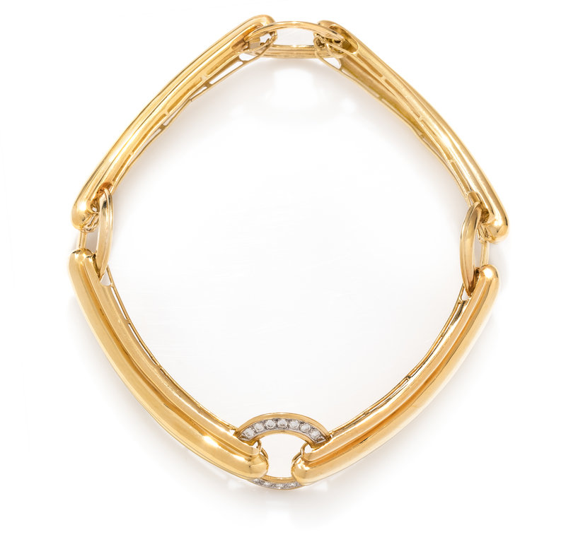 Consisting of four curved bar links with round connector links, one link containing 14 round brilliant cut diamonds weighing approximately 1.40 carats total.