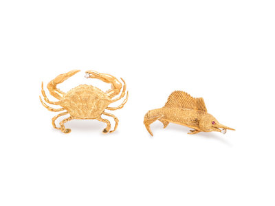 Consisting of a high polish and textured gold crab brooch containing one round brilliant cut diamond, together with a high polish and textured gold swordfish brooch containing one round brilliant cut diamond and one round mixed cut ruby eye.