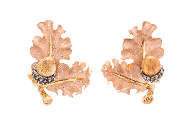 Consisting of two textured rose and yellow gold leaves and acorns, with silver detail, posts with clip backs.