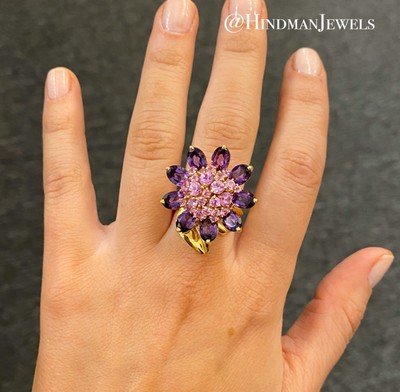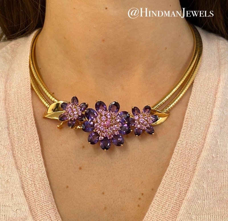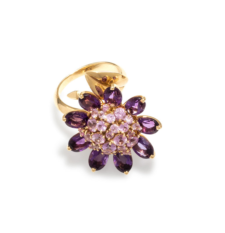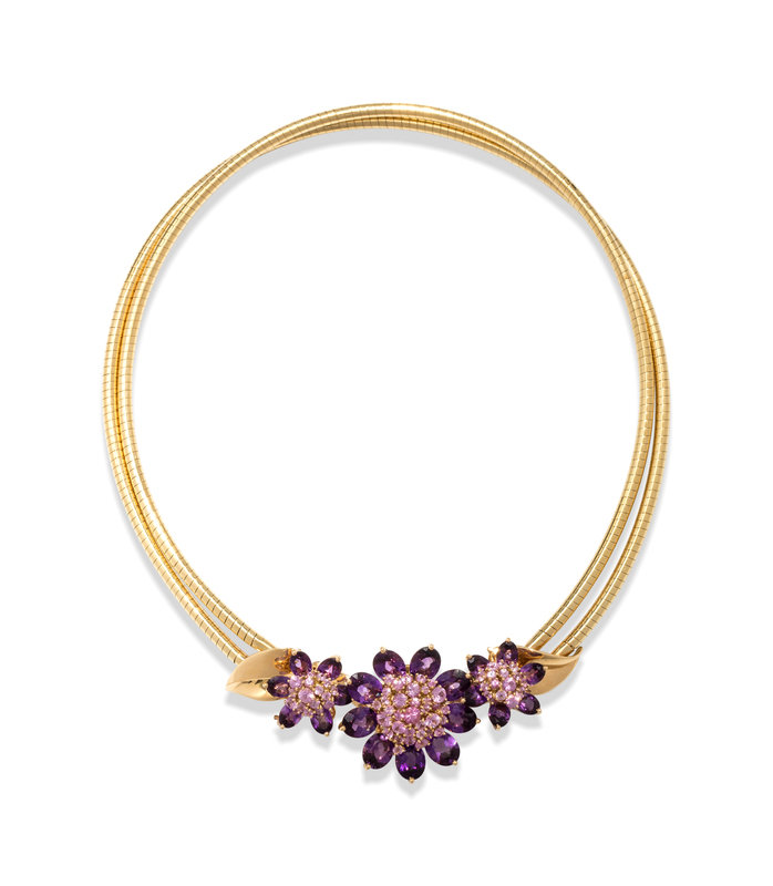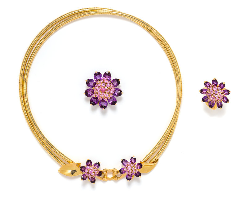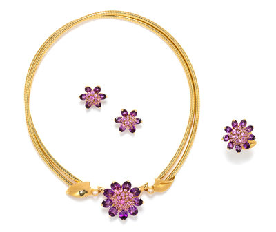 Consisting of a double snake chain collar necklace, the center section with three flowers containing 21 oval shape mixed cut amethyst and numerous round mixed cut pink sapphires, the largest flower can be removed to wear as a clip brooch and the two smaller flowers can be removed to wear as earclips, together with a ring with articulated flower head containing nine oval shape mixed cut amethyst and numerous round mixed cut pink sapphires. Mounted in yellow gold.
