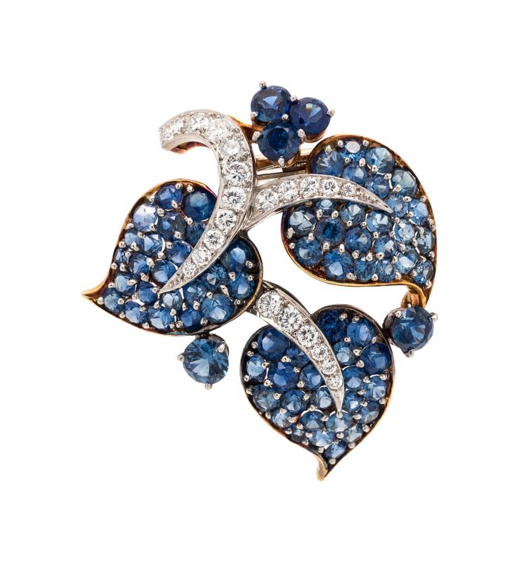 VAN CLEEF & ARPELS, NEW YORK, RETRO, SAPPHIRE AND 'FEUILLES' DIAMOND BROOCH