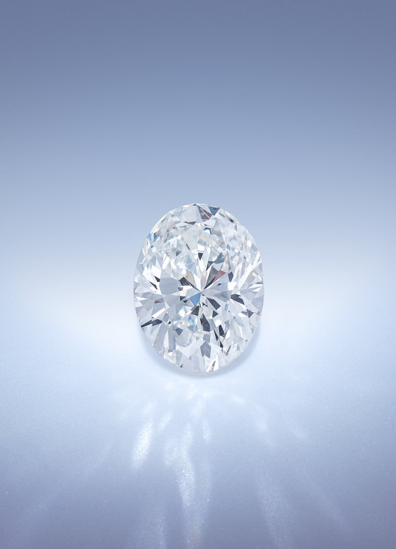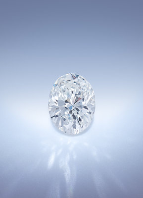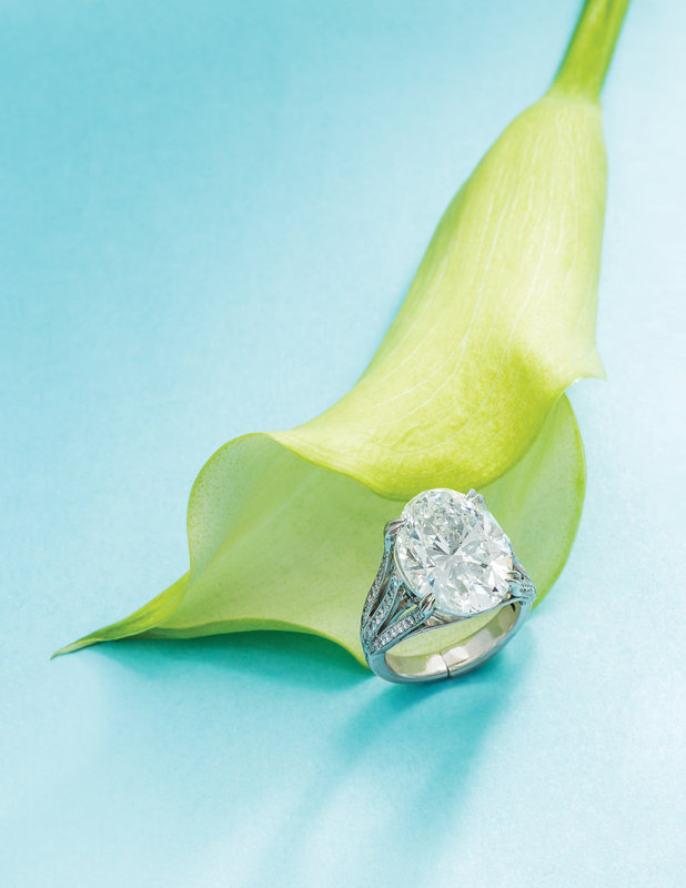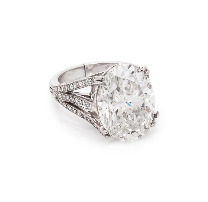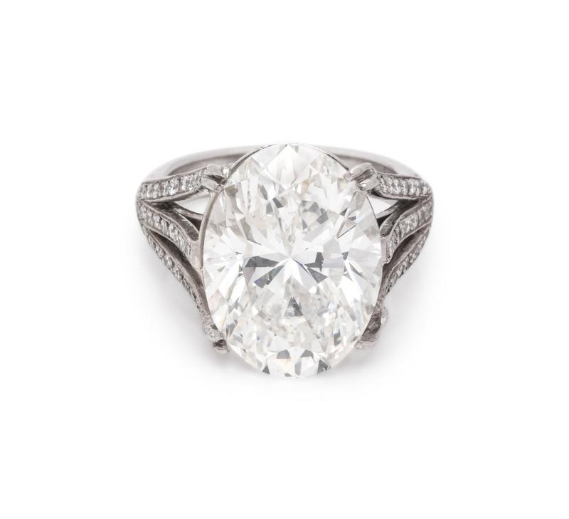 Containing one oval brilliant cut diamond weighing 10.17 carats and 60 round brilliant cut diamonds weighing approximately 0.25 carat total. Mounted in platinum with white gold expandable shank.